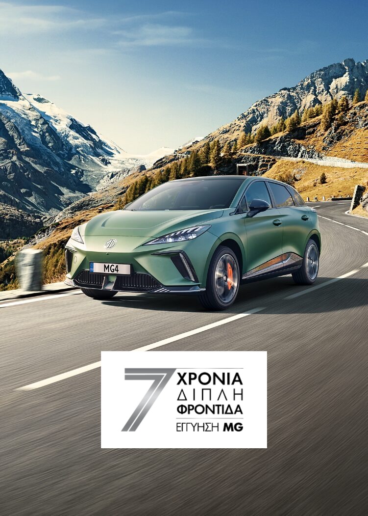 Η 7ετής εγγύηση ισχύει μόνο για αυτοκίνητα ιδιωτών. Για εταιρικά και επαγγελματικά αυτοκίνητα ισχύουν διαφορετικοί όροι εγγύησης. Για περισσότερες πληροφορίες επικοινωνήστε με τον πλησιέστερο εξουσιοδοτημένο επισκευαστή MG